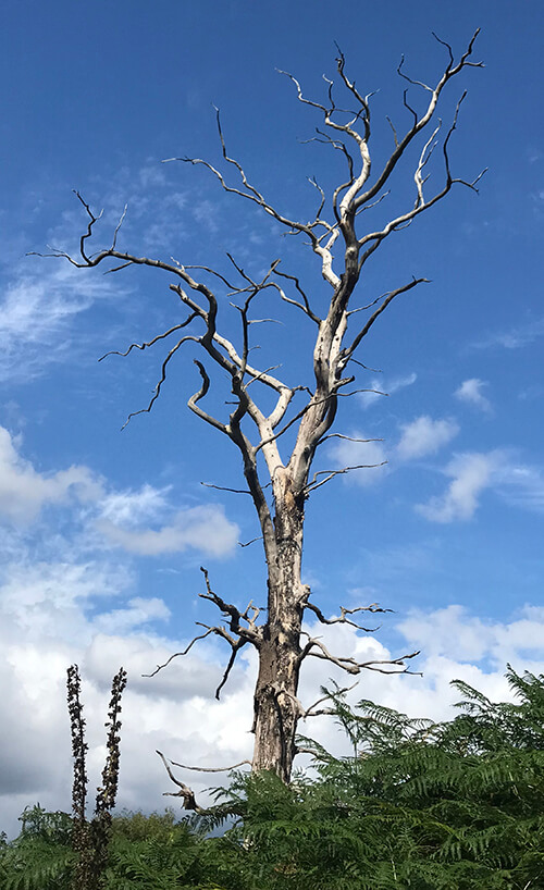 Past Glory reimagines a dead tree, bringing life back to its bare branches. Strong sunlight illuminates its angular forms, cutting a magnificent silvery silhouette against the cobalt blue sky.